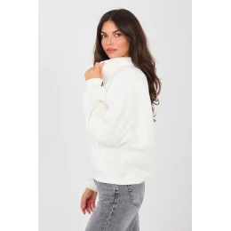 Elegantní dámská mikina standardní délky je ideální volbou pro ženy, které ocení pohodlí a minimalistický, ležérní styl. Hladký střih činí model univerzálním a snadno kombinovatelným s ostatními kousky šatníku a skvěle se hodí do každodenních stylizací. Mikina má dlouhý rukáv a praktický stojánek, který jí dodává moderní charakter a zajišťuje dodatečný komfort v chladnějších dnech. Zapínání na zip do poloviny délky usnadňuje oblékání a umožňuje upravit hloubku výstřihu podle vlastních preferencí. Model je vybaven funkčními kapsami na přední straně, které zvyšují pohodlí při nošení. Originálním prvkem je ozdobný vyšívání na rukávu a na přední straně v oblasti hrudníku vlevo, které dodává celku jemnou eleganci a jedinečný charakter. Mikina je vyrobena z vysoce kvalitní směsi bavlny s přídavkem elastanu, díky čemuž je měkká, pružná a příjemná na dotek, a zároveň se dobře přizpůsobuje postavě. Je to skvělá volba na procházku, nákupy nebo do práce v pohodlném provedení.