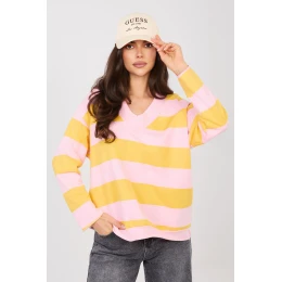 Stylový dámský mikina s casual charakterem je skvělým návrhem na každý den. Osloví jak ve městských stylizacích, tak při odpočinku nebo setkání s přáteli. Výrazný vzor v pestrobarevných pruzích jí dodává módní a svěží vzhled a přitahuje pozornost. Model standardní délky zajistí pohodlí a volnost nošení, a dlouhé rukávy zase zaručí, že se mikina ideálně hodí i na chladnější dny. Výstřih do V decentně zdůrazňuje krk a dodává celku ženský charakter. Mikina nemá zapínání, díky čemuž je snadno obléknutelná a skvěle padne na postavě. Vyrobena z vysoce kvalitní směsi bavlny a polyesteru, spojuje v sobě měkkost, prodyšnost a odolnost materiálu. Jedná se o univerzální kousek šatníku, který skvěle doplní jak džíny, tak látkové kalhoty nebo sukně, vytvářející pohodlné a stylové sestavy na každou příležitost.