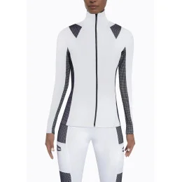 je z vysoce elastického funkčního materiálu, který odvádí vlhkost. Kombinovaný materiál na zádech tvoří zajímavý obrazec. Mikina je na zip s malým stojáčkem.