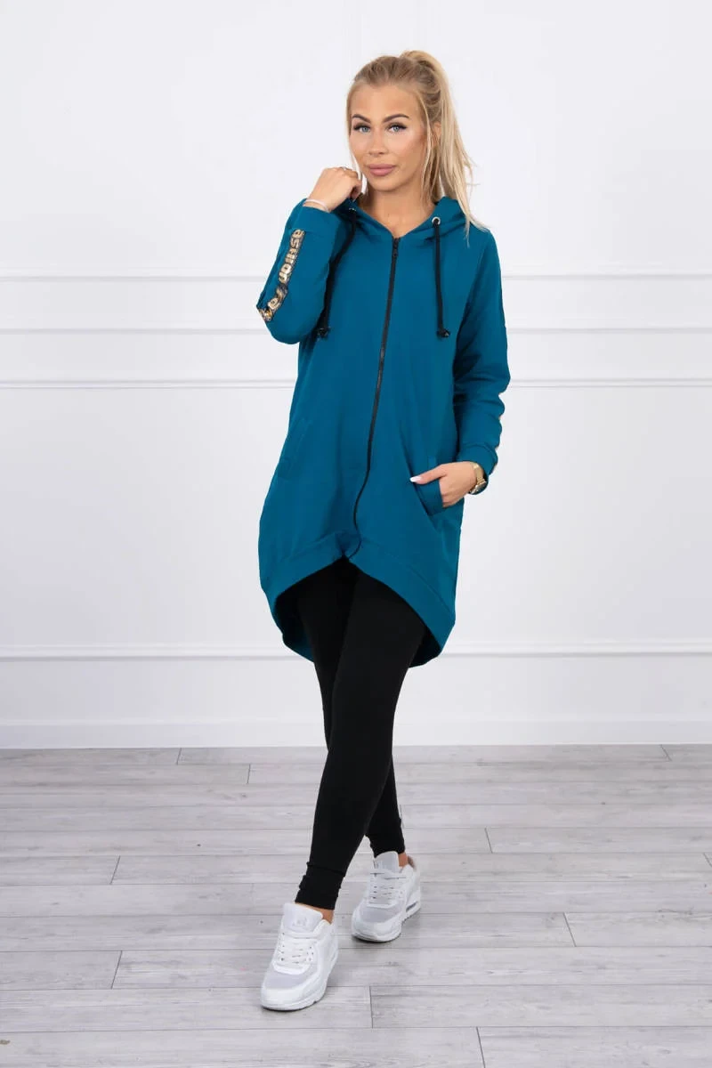 Představujeme vám pohodlnou dlouhou mikinu s kapucí. Mikina má zapínání na zip a další zip na zádech. Kapsy na bocích a dvě ozdoby na zadní straně. Mikina má našité stuhy s nápisem fashion. Mikina je vyrobena z vysoce kvalitního materiálu. Velikost je univerzální a vyhovuje dámám, které nosí velikost S, M nebo L.