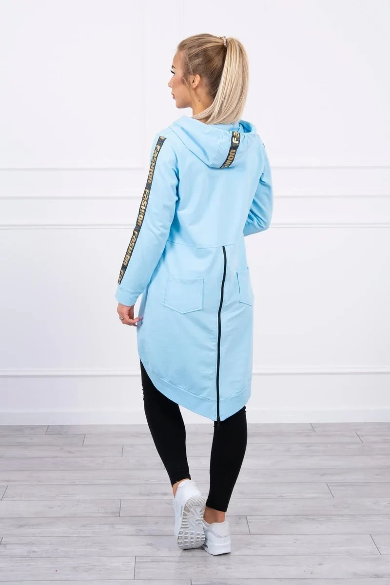 Představujeme vám pohodlnou dlouhou mikinu s kapucí. Mikina má zapínání na zip a další zip na zádech. Kapsy na bocích a dvě ozdoby na zadní straně. Mikina má našité stuhy s nápisem fashion. Mikina je vyrobena z vysoce kvalitního materiálu. Velikost je univerzální a vyhovuje dámám, které nosí velikost S, M nebo L.