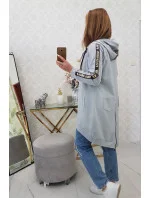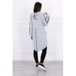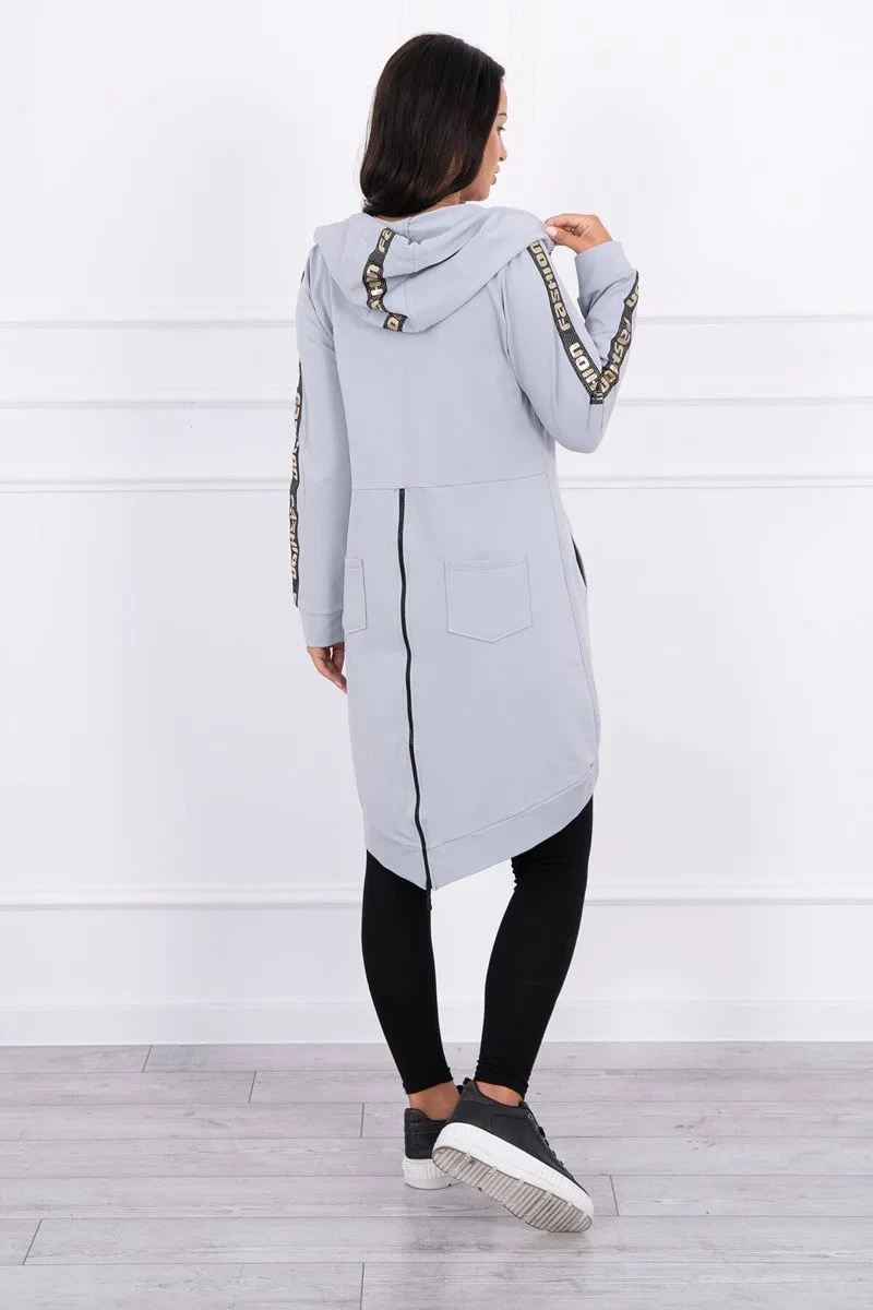 Představujeme vám pohodlnou dlouhou mikinu s kapucí. Mikina má zapínání na zip a další zip na zádech. Kapsy na bocích a dvě ozdoby na zadní straně. Mikina má našité stuhy s nápisem fashion. Mikina je vyrobena z vysoce kvalitního materiálu. Velikost je univerzální a vyhovuje dámám, které nosí velikost S, M nebo L.