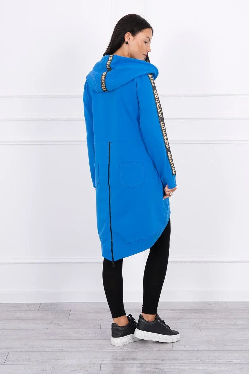 Představujeme vám pohodlnou dlouhou mikinu s kapucí. Mikina má zapínání na zip a další zip na zádech. Kapsy na bocích a dvě ozdoby na zadní straně. Mikina má našité stuhy s nápisem fashion. Mikina je vyrobena z vysoce kvalitního materiálu. Velikost je univerzální a vyhovuje dámám, které nosí velikost S, M nebo L.