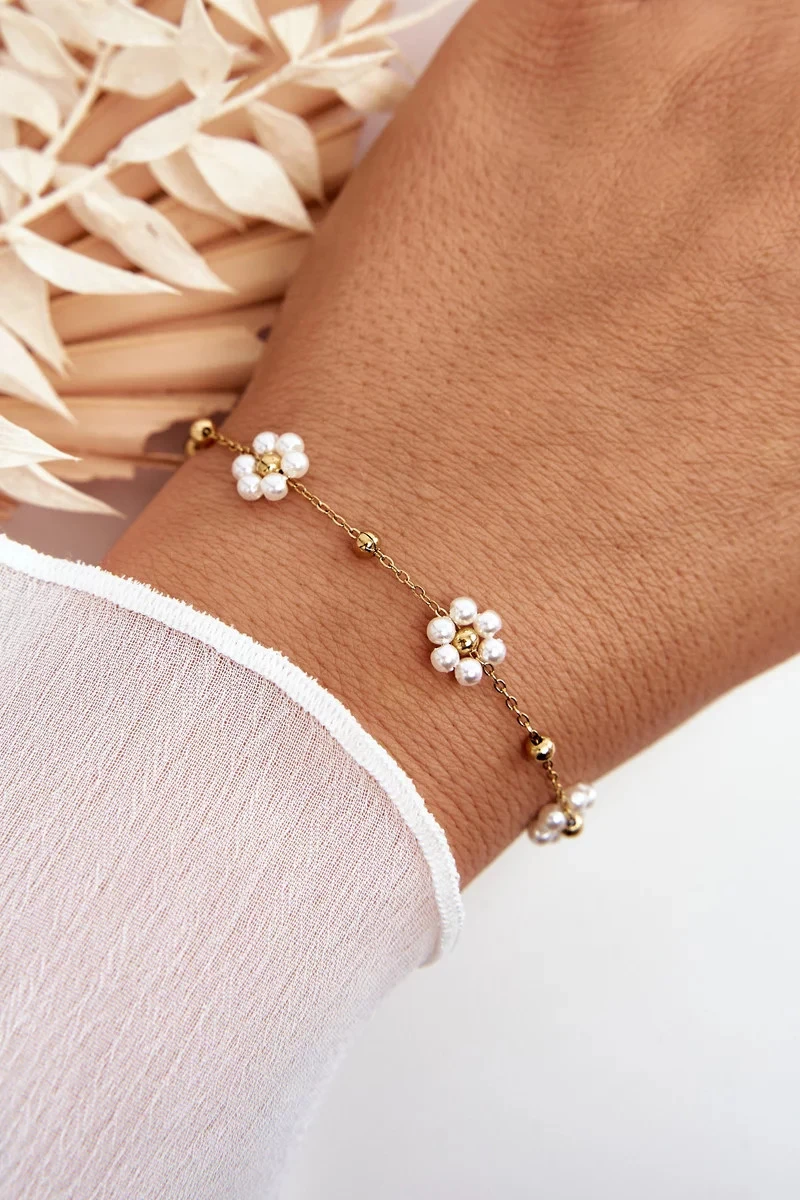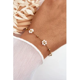 Módní náramek na tenkém řetízku celebrit s ankarskou vazbou. Je vyrobena z nerezové oceli. Je délkově nastavitelná. Všude jsou květinové ozdoby z korálků. Tento typ šperku je skvělým doplňkem nejen ke každodenním stylům, ale i k těm elegantnějším. Tento model má klasické zapínání na humrovou sponu.