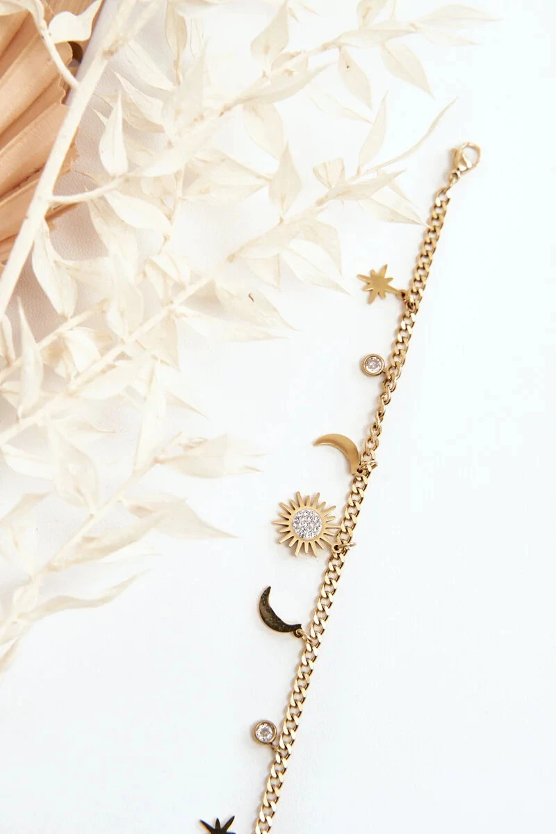 Náramek je vyroben z nerezové oceli. Je délkově nastavitelná a má několik přívěsků v podobě slunce, měsíce, hvězd a kamínků imitujících zirkony. Náramek vypadá velmi jedinečně. Podívejte se také na naši další nabídku modelů šperků. Musíte to mít!