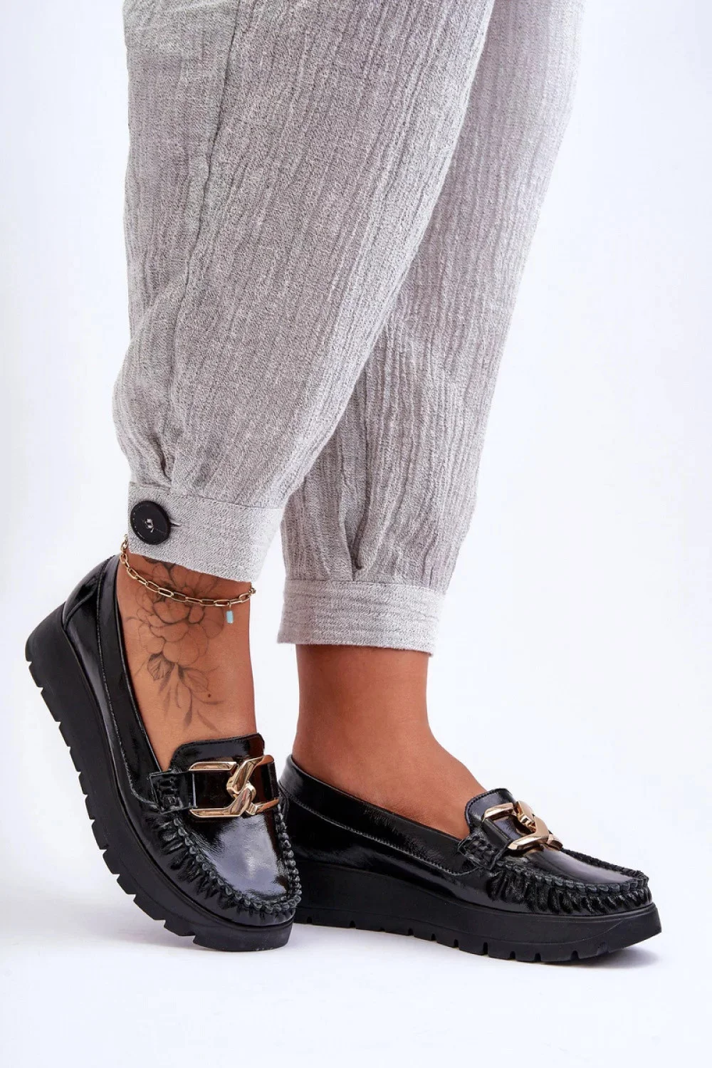 Tyto dámské mokasíny byly vyrobeny z přírodní kůže s důrazem na detail. Na přední straně mají ozdobu. Pultík na patě byl u těchto bot vyztužen, což umožní správnou stabilizaci chodidla. Mokasíny jsou usazeny na jemném klínu a platformě. Prohlédněte si další modely dostupné na našich webových stránkách!