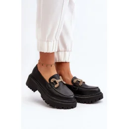 Dámské mokasíny z ekologické kůže. Osazené na masivním plochém podpatku a silné podrážce. Tento model má zakulacený nos a zlatý ornament na přední straně. Rozhodně byste je měli mít ve svém šatníku!