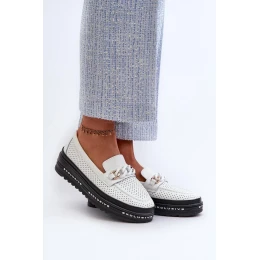 Dámské mokasíny vyrobené z přírodní kůže. Vpředu pásek s řetízkem. Nasazené na platformě, zajišťují dodatečné odpružení a stabilitu při chůzi. Kožená komfortní vložka. Tyto módní mokasíny skvěle doplní různorodé stylizace!
