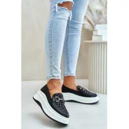 Elegantní dámské mokasíny z přírodní kůže jsou ideální volbou pro ženy, které ocení klasický styl s moderním nádechem. Stojí na platformě. Na přední straně boty je ozdoba, která dodává jedinečný charakter. Zaoblená špička. Ideální pro každodenní i formálnější outfity.