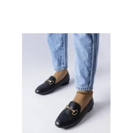 Černé mokasíny s přezkou Philip jsou elegantní boty na ploché podrážce, ideální pro různé outfit. Vyrobené z ekologické kůže, zdobené charakteristickým prošíváním a lesklou aplikací vpředu. Vnitřek je vyplněn měkkou pěnou pro pohodlné nošení. Univerzální barva zajišťuje, že budou ladit s různým oblečením. Skvěle sedí na úzkou nohu. Standardní číslování, doporučuje se držet své velikosti. Ideální na léto, zapínání na nasazení usnadňuje obouvání. Vnější materiál je ekologická kůže, podrážka je černá z umělé hmoty.