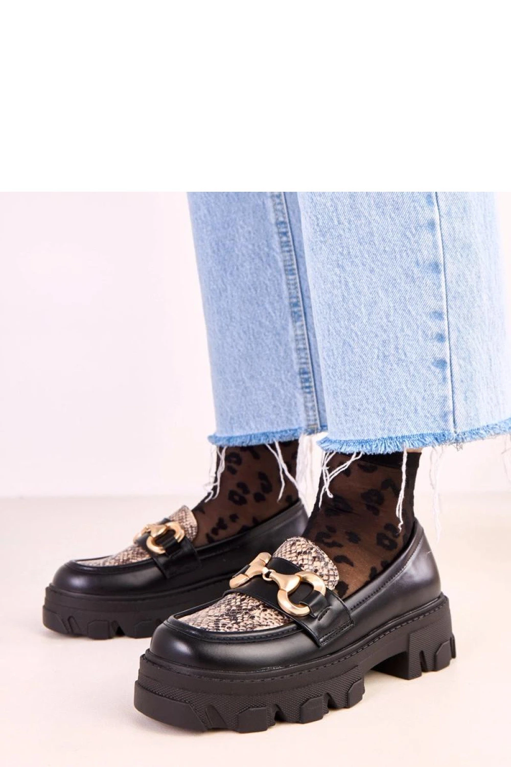 Elegantní a originální slip-on mokasíny vyrobené z vysoce kvalitní ekologické kůže, kombinující klasiku s módním, moderním akcentem. Na přední části jsou zdobeny stylovým výstřihem s motivem zvířete a zlatým doplňkem, který botám dodává výjimečný charakter. Model má kulatou špičku a stabilní podpatek o výšce 4,5 cm, který zajišťuje pohodlí při nošení. Vnější obložení zaručuje pohodlí v chladnějších dnech a vložka z ekokůže zvyšuje odolnost a potěšení z používání. Toto je nabídka pro ženy, které oceňují eleganci, pohodlí a decentní módní detaily ideální jak pro každodenní, tak i pro více stylové outfity.