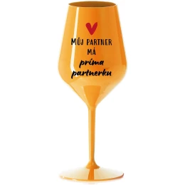 MŮJ PARTNER MÁ PRIMA PARTNERKU - oranžová nerozbitná sklenice na víno 470 ml