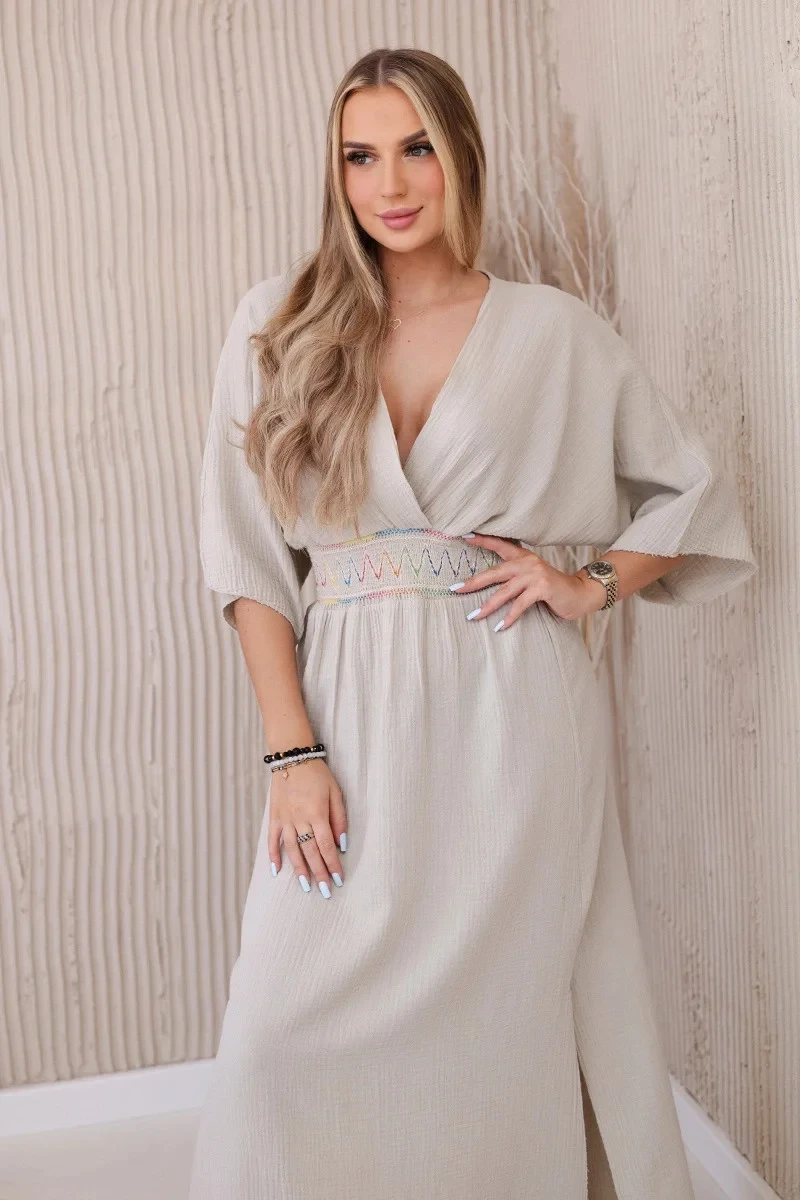 4. Mušelínové šaty s výšivkou v pase béžový