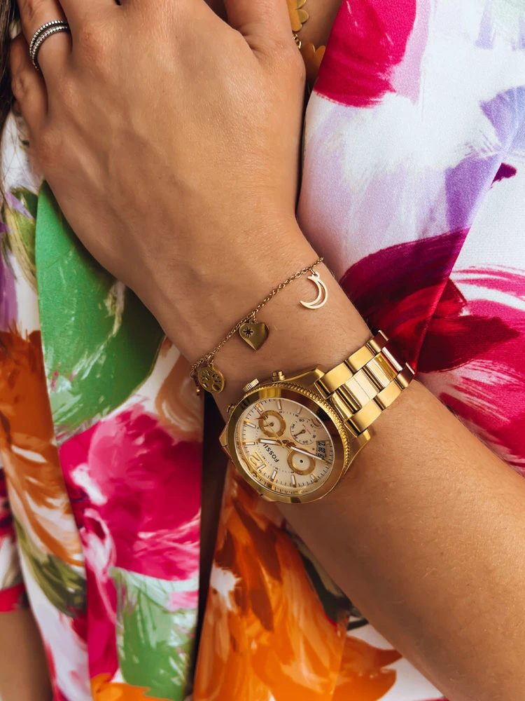 Náramek ARBOLE je mimořádně působivým návrhem pro každého z vás. Model ve zlaté barvě na řetízku s módními přívěsky musíte mít.