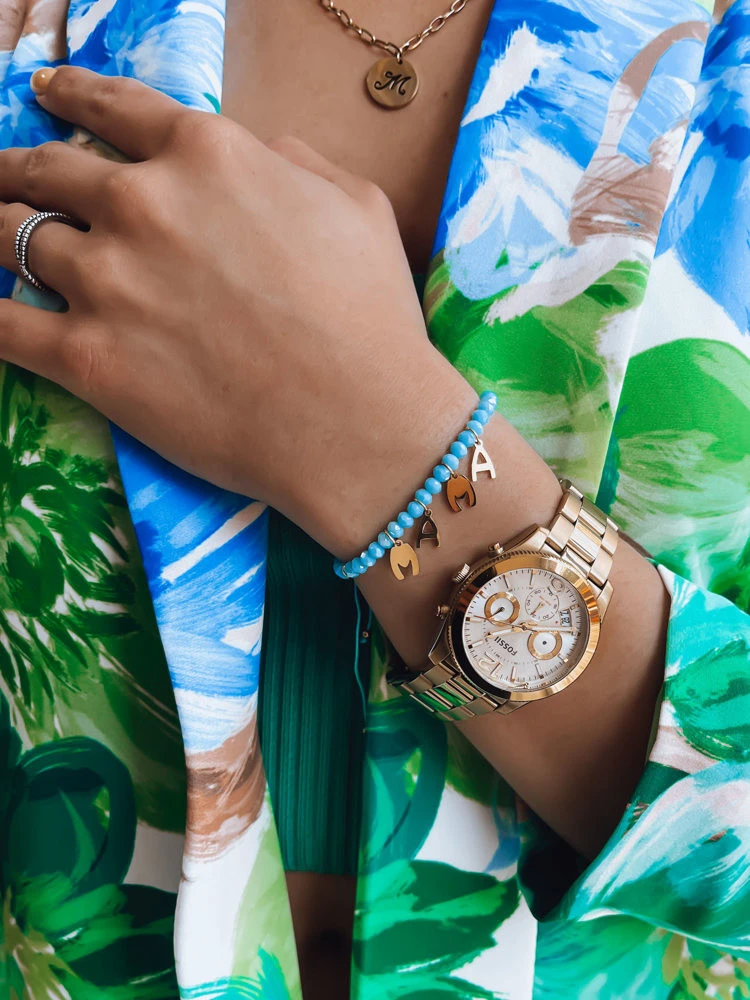 Tento okouzlující korálkový náramek se zavěšenými písmeny je nejen krásným doplňkem vašeho šatníku, ale také jedinečným způsobem, jak vyjádřit lásku k nejdůležitější osobě ve vašem životě - vaší mamince. Náramek je vyroben z jemně leštěných korálků, které na světle září, a vyzařuje eleganci a jemnost. To však není vše - zavěšená písmena, která tvoří slovo "máma", dodávají celému designu osobní a jedinečný nádech.