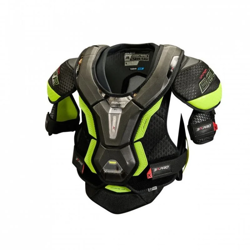 hokejové nárameníky Bauer Vapor 3X Pro Jr Úroveň: Performance Ochrana ramen: Tvarovaný nízkoprofilový štít Ochrana hrudní kosti: Volně připevněná ochrana hrudní kosti Hyperlite HD s vložkami z HD pěny