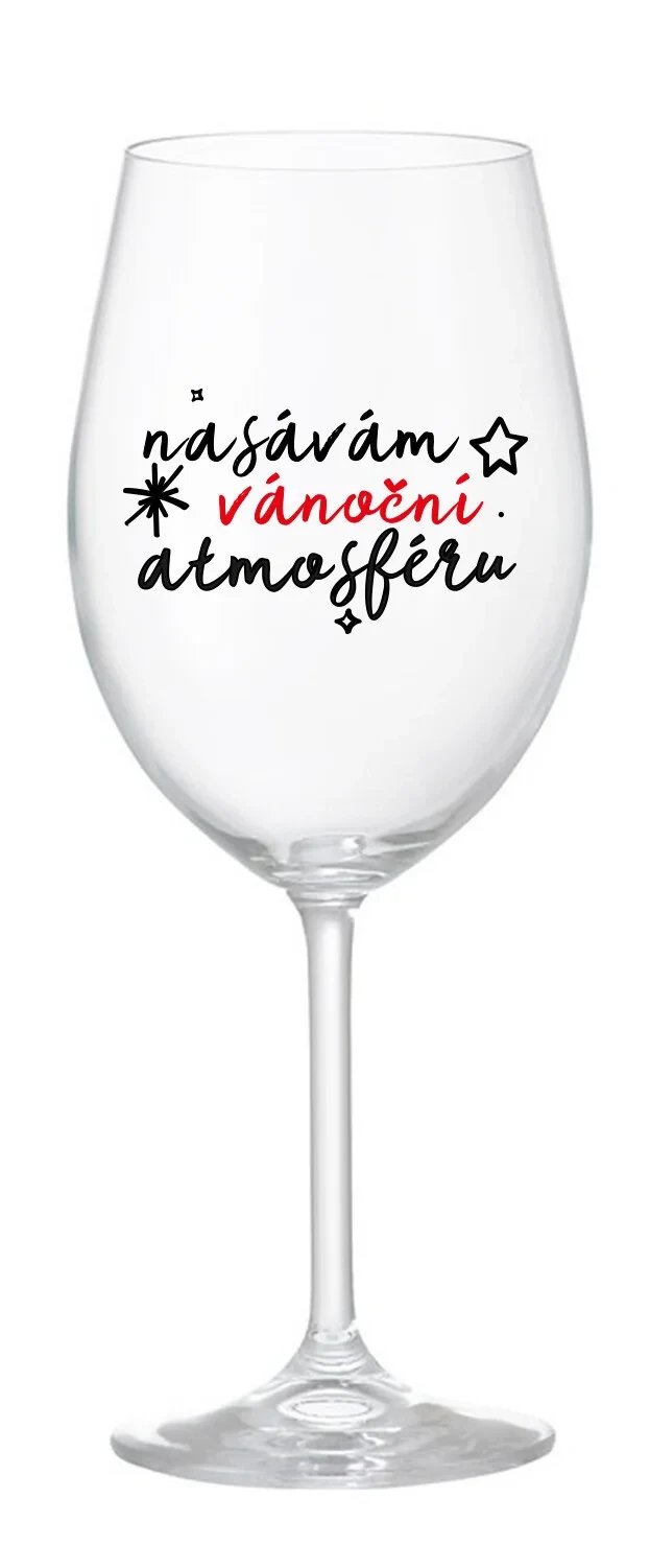 Vinná čirá sklenice s originálním motivem NASÁVÁM VÁNOČNÍ ATMOSFÉRU je krásným a osobitým dárkem, které ale využijete i Vy sami třeba ve chvílích, kdy si budete chtít zpříjemnit náročný den. Tyto originální vinné sklenice jsou totiž nejen pro výjimečné události, ale i pro běžné večery, které si chcete zpříjemnit sklenkou dobrého vína. Jistě proto potěší každého milovníka vína, i toho, kdo si umí svůj život vychutnat plnými doušky.