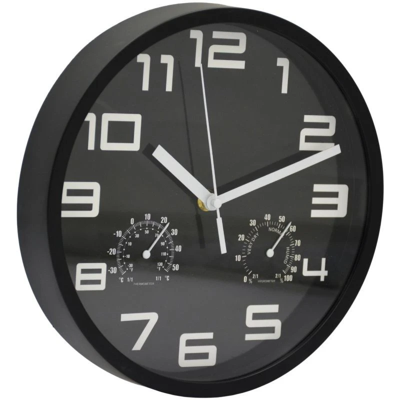 NÁSTĚNNÉ HODINY 25CM S TERMOMETREM ČERNÉ jsou moderní hodiny s přehledným zobrazením času, teploty a úrovně vlhkosti. Mají jednoduchý, minimalistický design a jsou ideální do kanceláří, moderních interiérů i na pracoviště.