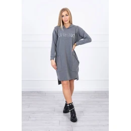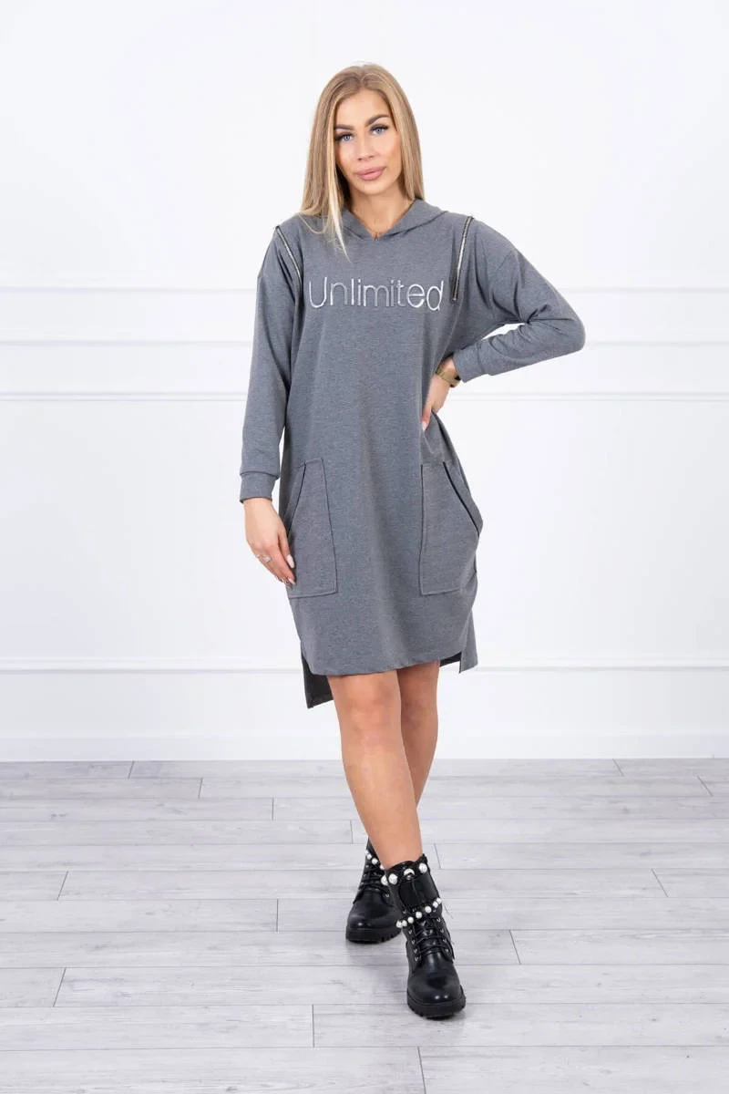 Představujeme vám módní šaty. Na šatech je nápis unlimited. Vrchní část šatů má svislé zipy. Šaty s delšími zády a kapucí. Šaty s kapsami s nášivkami. Ideální každodenní poloha. Šaty jsou vyrobeny z vysoce kvalitního materiálu. Velikost je univerzální a vyhovuje dámám, které nosí velikost S, M nebo L.