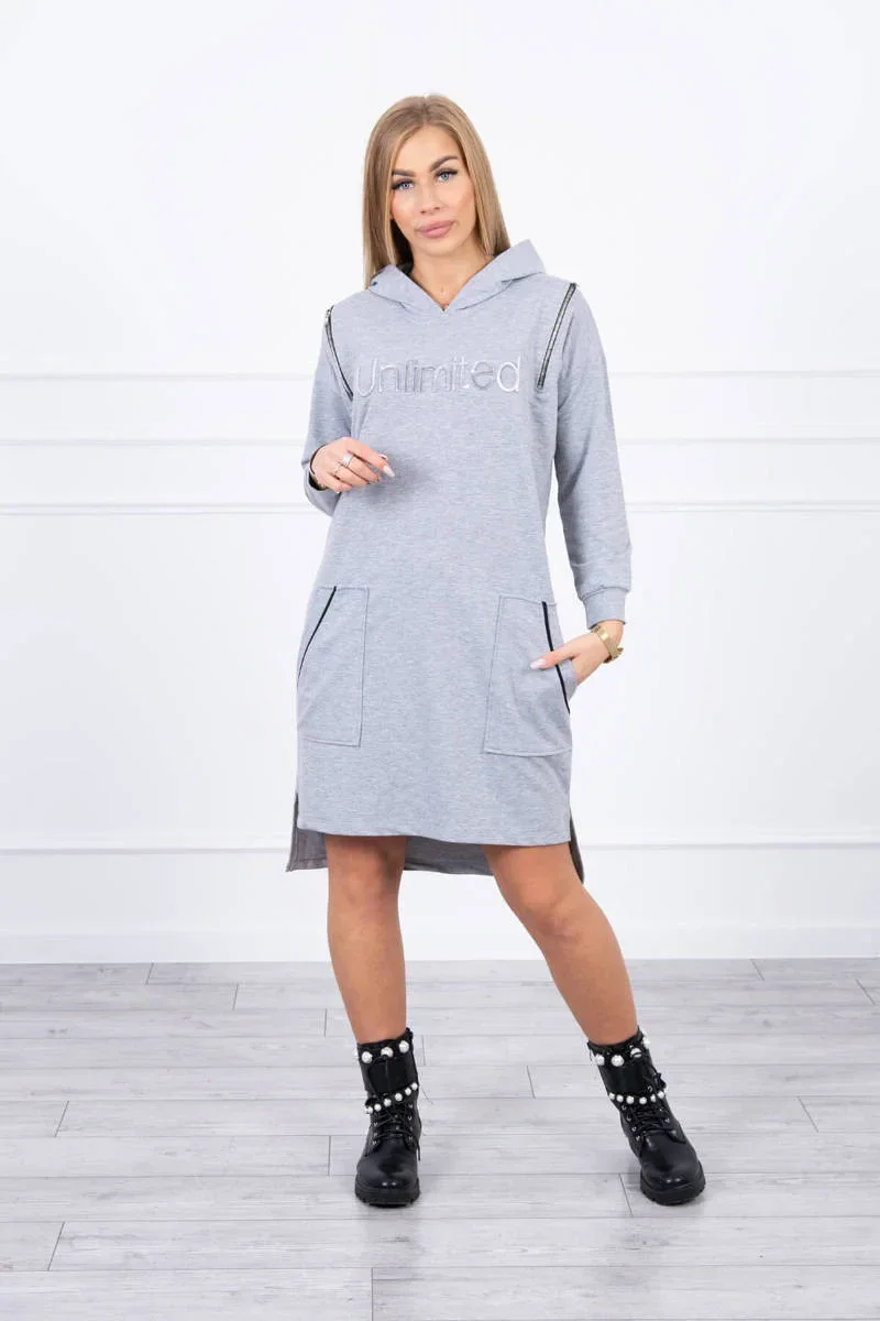 Představujeme vám módní šaty. Na šatech je nápis unlimited. Vrchní část šatů má svislé zipy. Šaty s delšími zády a kapucí. Šaty s kapsami s nášivkami. Ideální každodenní poloha. Šaty jsou vyrobeny z vysoce kvalitního materiálu. Velikost je univerzální a vyhovuje dámám, které nosí velikost S, M nebo L.