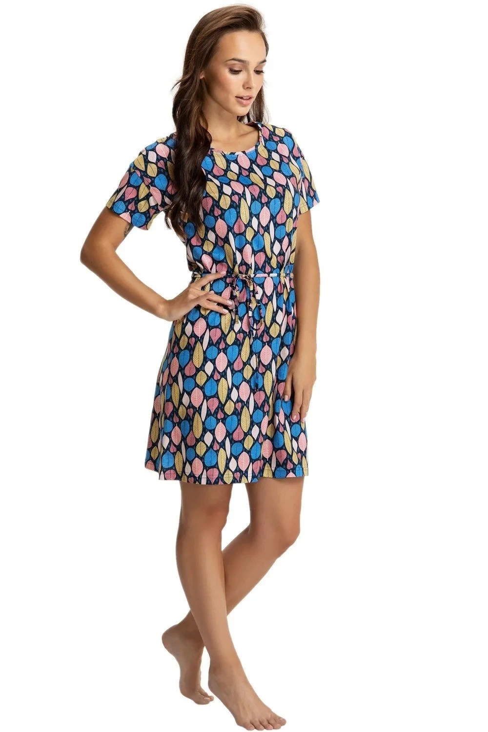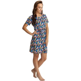 Noční košile 116 blue Luna - tmavě modrá barva - z vysoce kvalitní bavlny - krátké rukávy - ozdobená pestrým vzorem - vázání na pásek - délka nad kolena