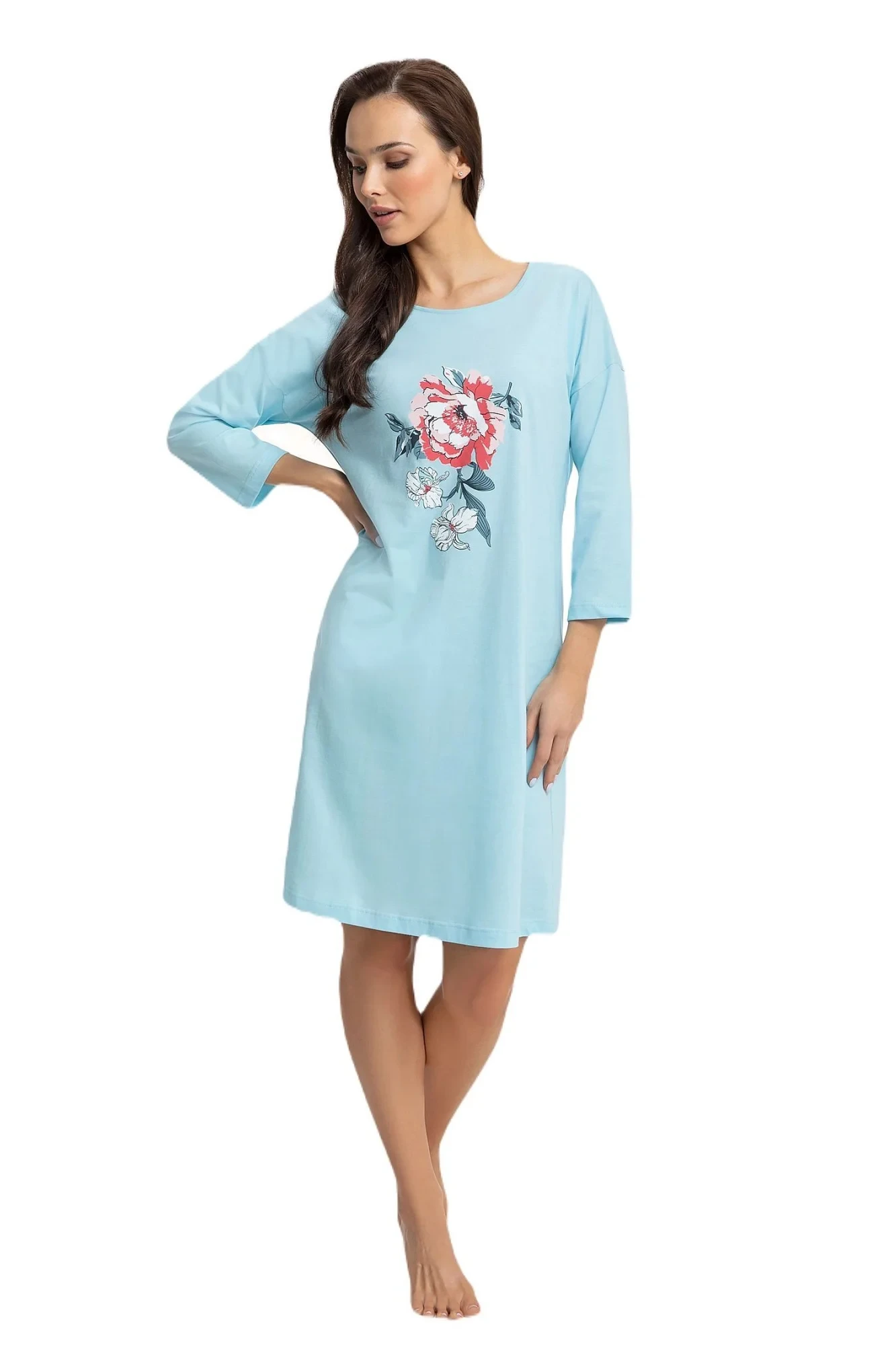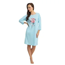 Noční košile 128 plus Luna - tyrkysová barva - z vysoce kvalitní bavlny - tříčtvrteční rukávy - ozdobená potiskem na přední straně - délka nad kolena