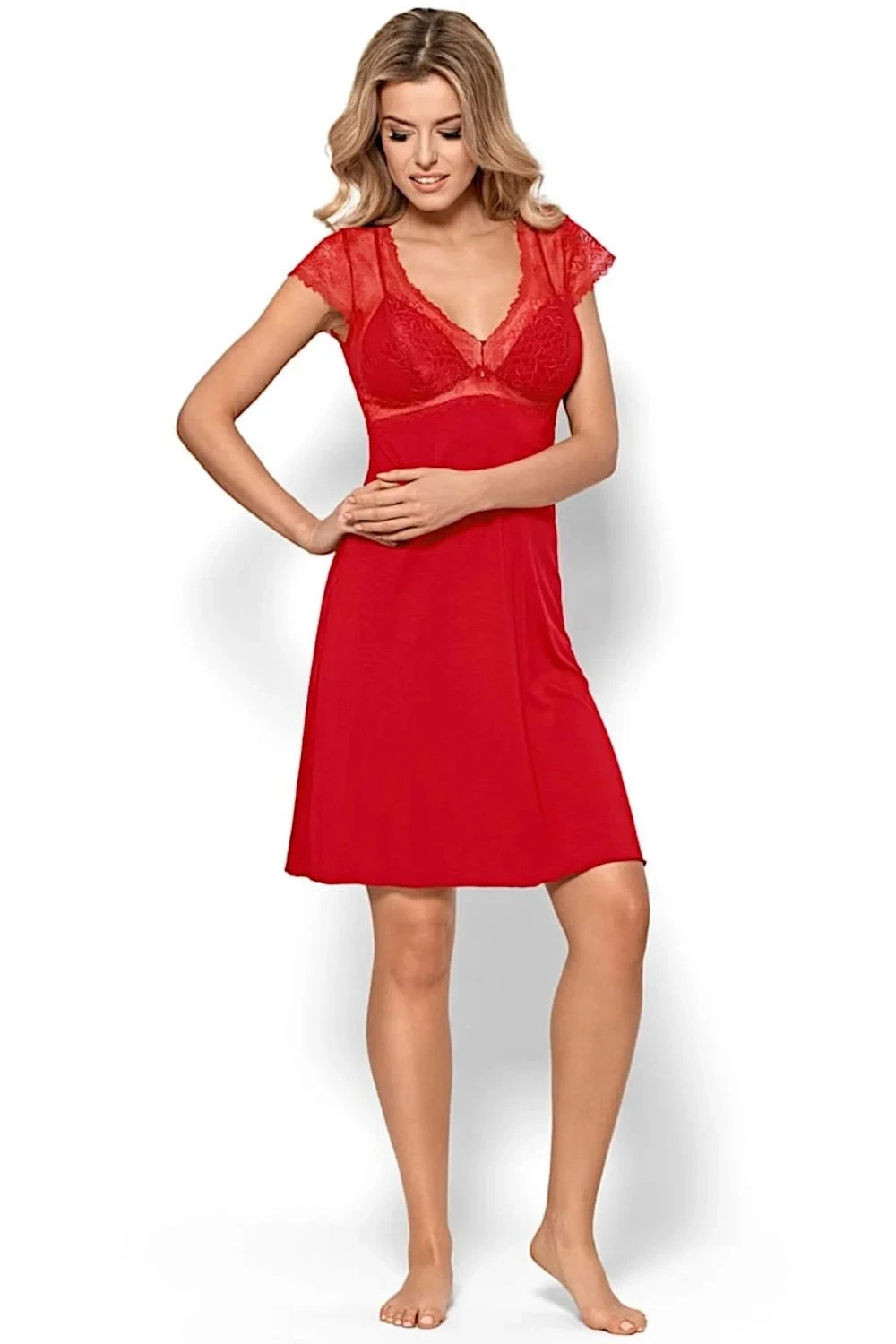 Dámská noční košilka Bianca red NIPPLEX - červená barva - z vysoce kvalitní viskózy - košíčky zdobené krajkou s květinovým motivem - krátké krajkové rukávy - délka nad kolena