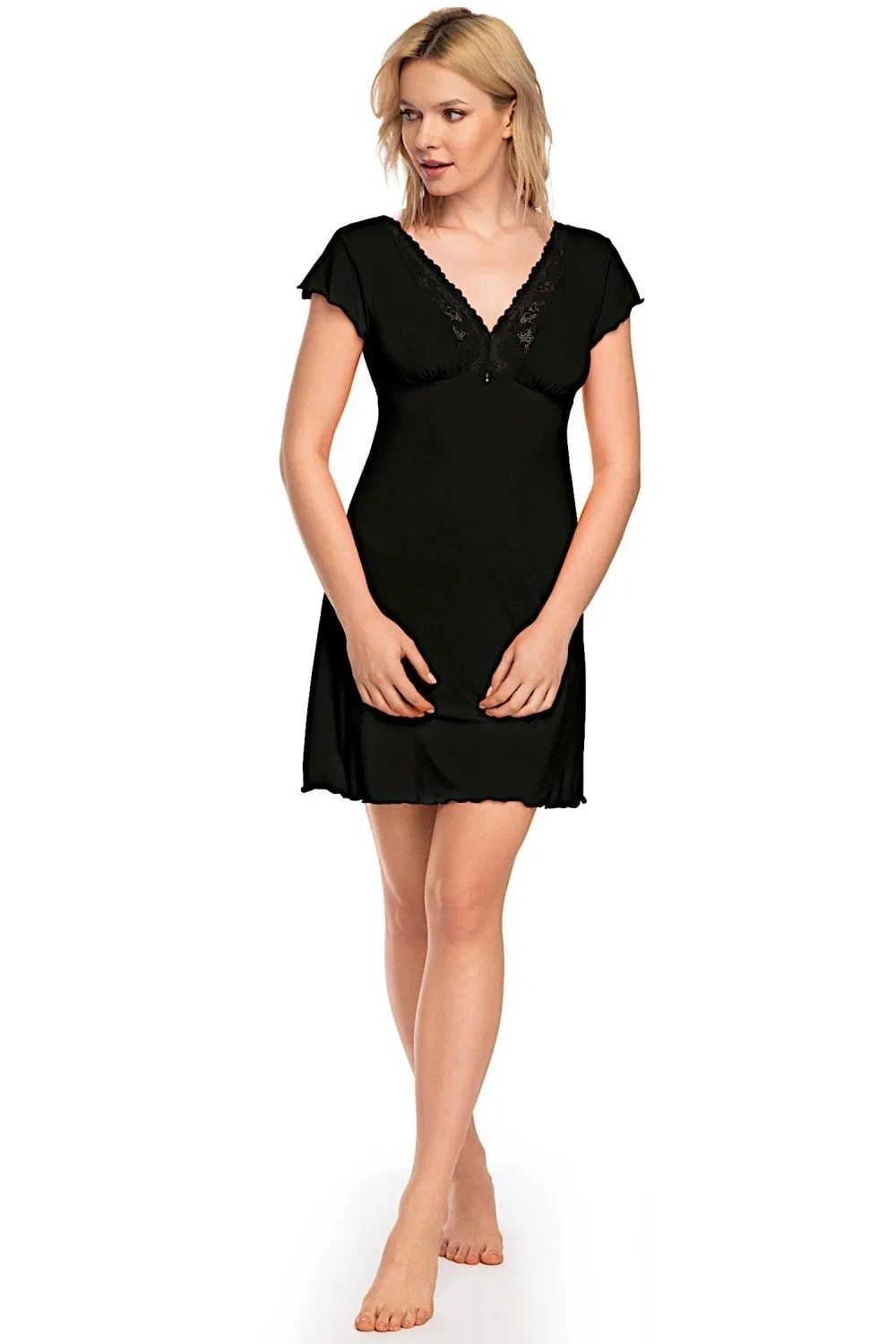 Noční košile Estera black NIPPLEX - černá barva - z vysoce kvalitní viskózy - krátké rukávy - výstřih zdobený efektní krajkou - délka nad kolena