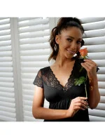 Vrchní linie poprsí a rukávky jsou ušité z ažurové krajky s květinovým motivem. Košilka se směrem dolů lehce rozšiřuje. Model má délku nad kolena.