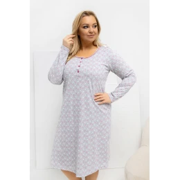 Pohodlná noční košile plus size v jednoduchém šatovém střihu, kombinující pohodlí s ženským stylem. Dominujícím motivem jsou jemné srdíčka, která dodávají celku jemnou lehkost a šarm. Model je vyroben převážně z měkké, příjemné bavlny, která zajistí pohodlný spánek a volnost pohybu. Košile má klasický kulatý výstřih a dlouhé rukávy, které chrání před chladem. V přední části jsou umístěny čtyři knoflíky, které dodávají elegantní detail a usnadňují oblékání. Délka nad koleno dělá košili jak pohodlnou, tak stylovou, ideální pro relaxaci doma.
