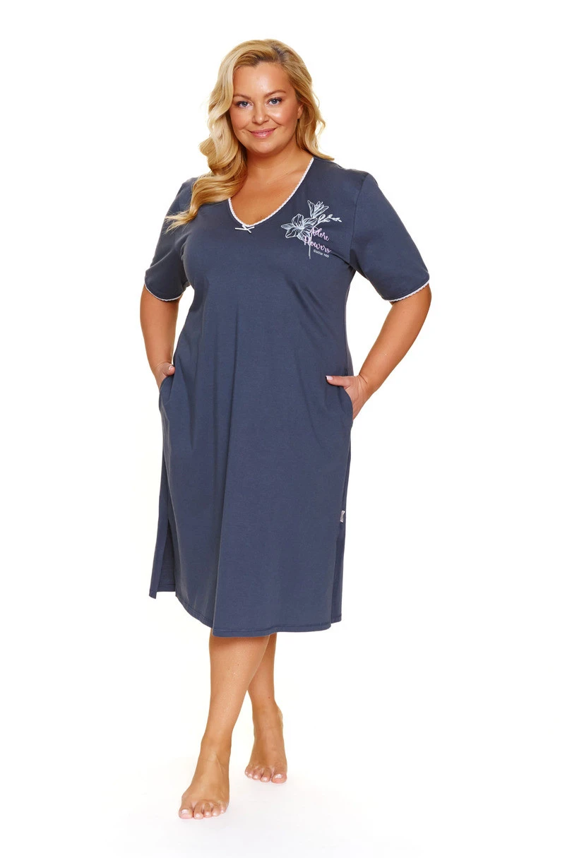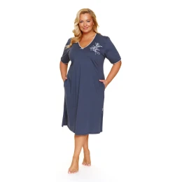 Koszula nocna TB.7263 J/25 to idealny wybór dla kobiet plus size, które cenią połączenie komfortu i elegancji. Uszyta z wysokiej jakości dzianiny bawełnianej, jest miękka, oddychająca i przyjemna w dotyku. Luźny krój zapewnia swobodę ruchów i wygodę podczas snu, a jednocześnie subtelnie podkreśla kobiecą sylwetkę. Dekolt w kształcie litery V ozdobiono delikatnym haftem i małą kokardką, co nadaje koszuli romantycznego charakteru. Praktyczne kieszenie zwiększają funkcjonalność, a rozcięcia po bokach dodatkowo podnoszą komfort noszenia. To ponadczasowa propozycja, która sprawdzi się zarówno jako bielizna nocna, jak i wygodny strój domowy.