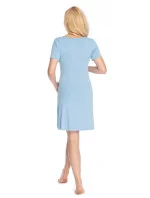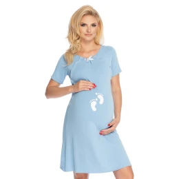 Těhotenská noční košile s ozdobnou mašlí a krátkými rukávy. Funkce kojení se zapíná pomocí tlačítek. Lze nosit i po těhotenství. Dětské nohy na břiše, flexotisk.