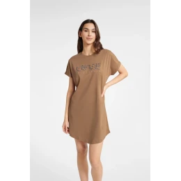 Dámská bavlněná noční košile s krátkými rukávy Boutique je určena pro dámy, které se cítí pohodlně ve volném jednodílném oblečení na spaní. Model sahá před kolena a je jemně vypasovaný, zatímco rukávy zdobí decentní řasení. Celý oděv je vyrobený z přírodního, prodyšného materiálu. Noční košile Boutique v karamelové barvě představuje moderní pojetí nočního prádla. Na hrudi tohoto modelu je poutavý nápis, který je částečně vyrobený z látky zdobené zvířecím potiskem. Dívčí nádech dodává textu vetkaný motiv srdce.