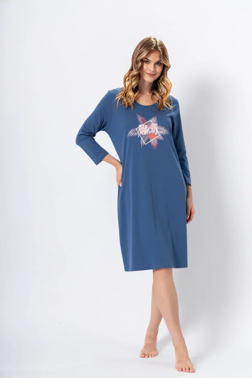 Pokud jste milovníky tmavších barev a naprosté ležérnosti, je tu něco pro vás! Noční košile Kasia jistě splní vaše očekávání. Potěší nejen stylem, ve kterém je vyrobena, ale také barvou - krásným odstínem tmavého denimu. Má 7/8 rukávy a kulatý výstřih. Na hrudi je barevný potisk, který doplňuje tuto skladbu. Délka košile sahá ke kolenům, což zajišťuje volnost pohybu a pohodlí. Je vyrobena ze 100% bavlny, která zaručuje maximální pohodlí při nošení. V této košili se budete cítit nejen stylově, ale po náročném pracovním dni vám poskytne maximální pohodlí a zasloužené pohodlí. Je ideální volbou pro ty, kteří ocení pohodlí a ležérní, uvolněný styl.