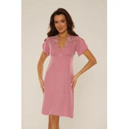 Noční košile z vysoce kvalitní viskózy příjemné na dotek. Kulatý výstřih, délka před kolena. Model s krátkými rukávy zdobený krajkou. Velmi pohodlný střih, jemně přiléhající k tělu. Osloví ženy, které milují jemnost a volnost.