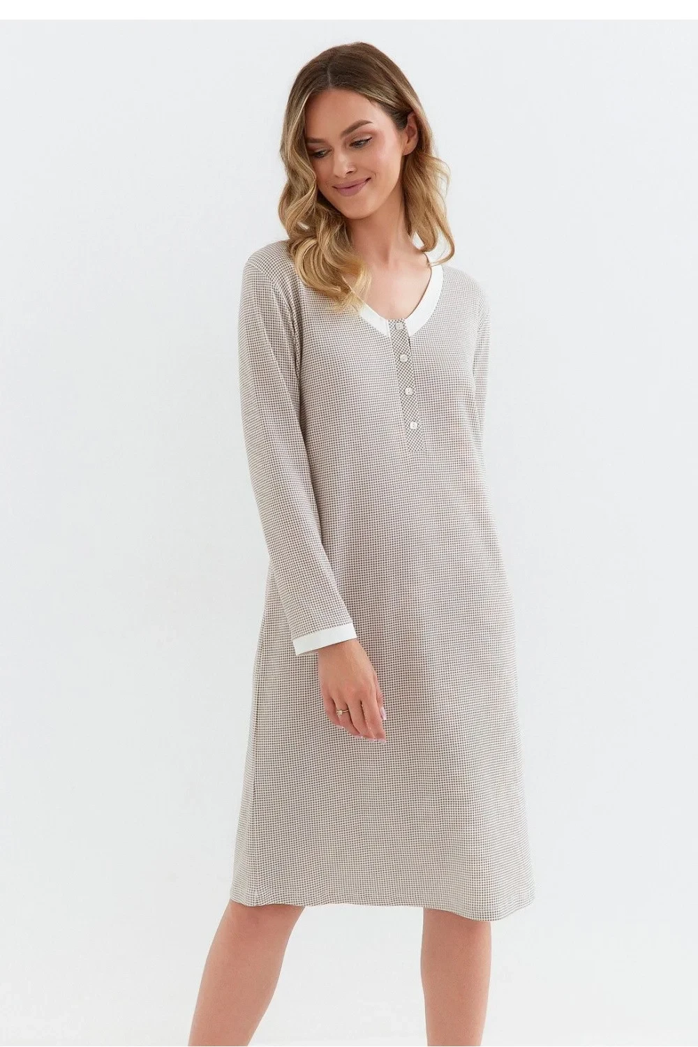 Dámská noční košile s dlouhým rukávem vyrobená z vysoce kvalitní bavlny typu interlock je ideální volbou na chladné noci. Měkký, příjemný na dotek materiál s jemným potiskem zajistí pohodlí a teplo. Volný, pohodlný střih zaručuje pohodlí během spánku a knoflíky ulehčují oblékání, což tento model činí ideálním také pro kojící maminky. Výstřih je zakončen lemovkou, co dodává celku estetické provedení. Košile má délku po kolena a je zabalená v praktickém fóliovém sáčku, skvělá také jako dárek.