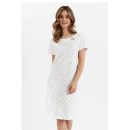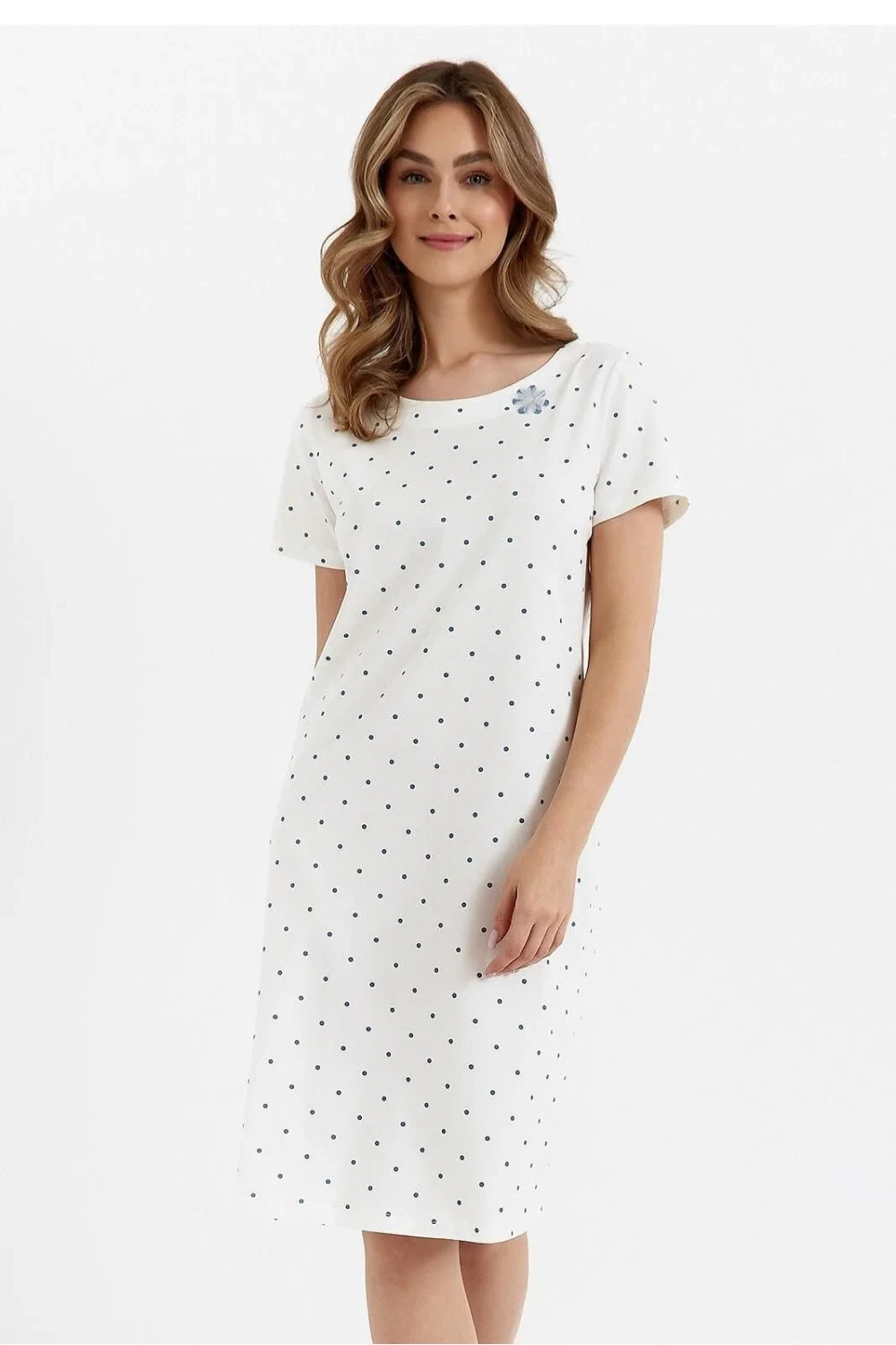 Dámská noční košile s krátkým rukávem je pohodlným a praktickým návrhem na každý den. Vyrobená z lehkého materiálu s roztomilým potiskem, poskytuje pohodlí a prodyšnost. Kulatý výstřih, volný střih a délka nad koleno zaručují volnost pohybu a pohodlí během spánku. Celý kus je zabalen v fóliovém sáčku, díky čemuž se skvěle hodí také jako dárek.