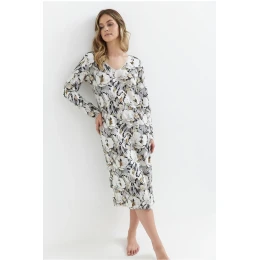 Dámská noční košile je elegantní nabídkou pro klidný spánek. Vyrobená z měkké tkaniny s potiskem, poskytuje pohodlí a potěšení při nošení po celou noc. Výstřih do špičky, zdobený jemnou krajkou, jí dodává subtilní kouzlo. Délka po kolena a volný, pohodlný střih zaručují volnost pohybu, zatímco dlouhé rukávy, také zdobené krajkou, zdůrazňují její elegantní charakter. Celý kousek je zabalena do praktického fóliového sáčku, což z ní dělá skvělý dárek.