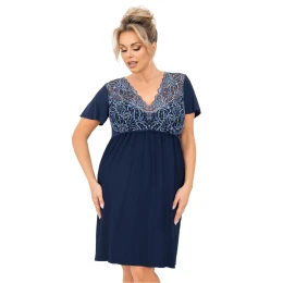 Dámská a pohodlná noční košile velikosti plus, navržená s ohledem na plnější tvary a maximální pohodlí při spaní. Vyrobená z měkké, prodyšné viskózy, přiléhá k tělu lehkostí a poskytuje příjemný pocit na kůži po celou noc. Košile má V výstřih, který jemně zdůrazňuje poprsí, a elastický pásek umístěný těsně pod ním jemně modeluje postavu. Horní část je zdobená elegantní krajkou, dodávající romantický charakter, zatímco záda zůstávají hladká a klasická. Krátký rukáv a spodní lem košile jsou zdobeny dekorativní krajkou, což dodává celku lehkost a jemnost. Model s délkou po kolena a volným, pohodlným střihem zajišťuje volnost pohybu a skvělý pocit každou noc. Ideální volba pro ženy, které ocení pohodlí, styl a ženský akcent v nočním prádle.
