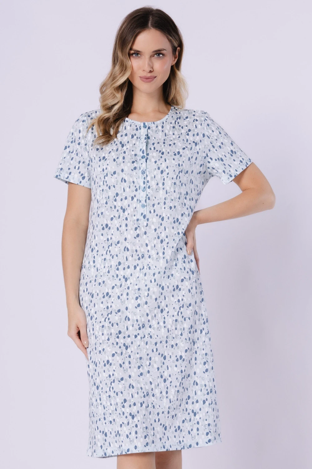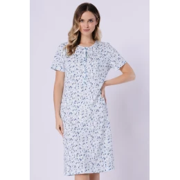 Tato noční košile spojuje pohodlí s funkčním designem. Má kulatý výstřih a krátký rukáv, volný a pohodlný střih zajistí plnou volnost pohybu. Vyrobena z měkké a prodyšné látky s potiskem, zaručuje příjemné nošení po celou noc. Model vybavený zapínacími knoflíky usnadňuje oblékání a svlékání. Košile sahá za kolena a celý kus je balen v praktickém fóliovém sáčku, co z ní dělá skvělý dárek.