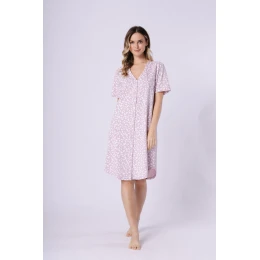 Tato noční košile spojuje pohodlí s jemným, klasickým stylem. Volný, pohodlný střih a měkká a prodyšná tkanina s potiskem zaručují plnou volnost pohybu a pohodlí nošení po celou noc. Model sahá po kolena, má krátký rukáv a polokruhový spodek, co jí dodává lehkosti a ženského charakteru. Košile se zapíná na knoflíky po celé délce a decentní barevnost jí dodává elegantní, klidný vzhled. Celkový vzhled je balen do praktické fóliové tašky, která je také ideální jako dárek.