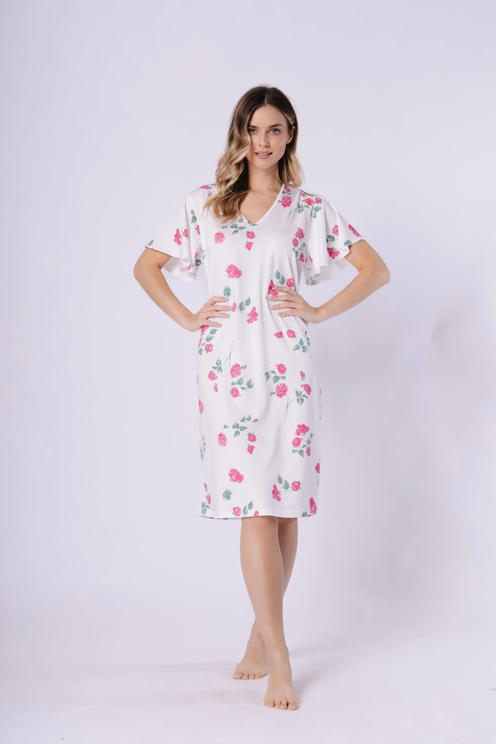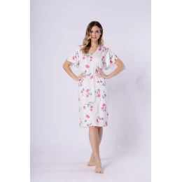 Tato noční košile spojuje pohodlí s decentním stylem. Má výstřih ve tvaru písmene V a volný, pohodlný střih, který poskytuje plnou volnost pohybu. Krátký, široký rukáv dodává lehkost a volný charakter, a měkká a prodyšná látka s potiskem zaručuje pohodlí po celou noc. Košile sahá po kolena a celý kus je balen do praktického fóliového sáčku, co z ní dělá skvělý dárek.