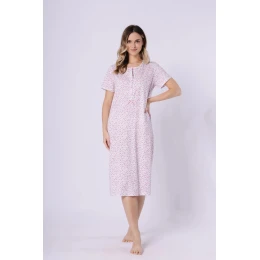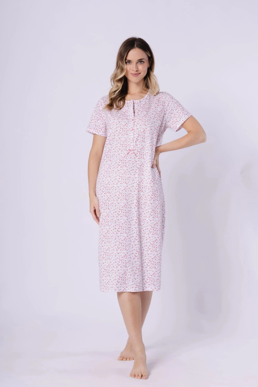 Tato noční košile byla navržena s maximálním pohodlím na mysli. Kulatý výstřih a volný, pohodlný střih zajistí volnost pohybu a pohodlí během spánku. Model dlouhý po kolena je vyroben z měkké a prodyšné látky s potiskem, která příjemně obepíná tělo. Krátký rukáv z ní dělá ideální košili na teplejší noci. Zapínání na knoflíky do poloviny délky přidává funkčnost a klasický charakter. Celý kousek je balen v praktickém fóliovém sáčku, ideální také jako dárek.