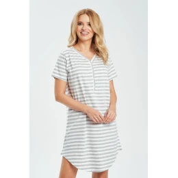 Noční košile po kolena je pohodlný a praktický model, ideální na noční odpočinek a relaxaci doma. Krátký rukáv zajišťuje pohodlí a prodyšnost, a polokruhový lem dodává košili lehkost a jemný ženský charakter. Model je vybaven zapínáním na knoflíky, které usnadňují oblékání a svlékání, zvyšují tak funkčnost košile. Celý kus je zabalena do fóliového sáčku, který chrání výrobek a usnadňuje jeho skladování.
