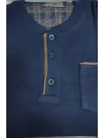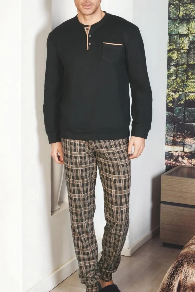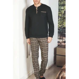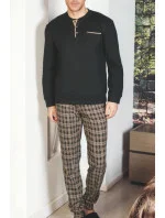 Pánské pyžamo ušité z měkké silnější bavlny. Tričko s dlouhým rukávem a kapsou na přední straně. Doplněno dlouhými kostkovanými kalhotami. Výstřih, manžety a spodní část košile a kalhot jsou zakončeny pohodlným žebrovaným lemem.