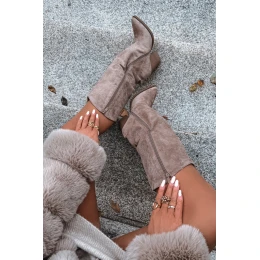 Oceplane cowboy kozačky na podpatku z eko semiše béžové Mavine Kozaki Damskie