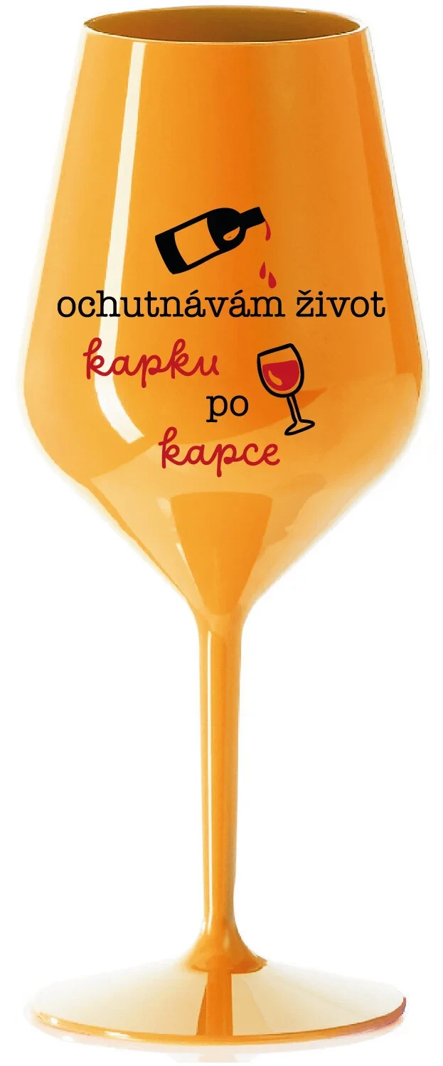 OCHUTNÁVÁM ŽIVOT KAPKU PO KAPCE - oranžová nerozbitná sklenice na víno 470 ml