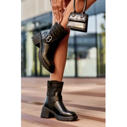 Dámské boty vyrobené z kombinace eko kůže a textilního materiálu. Osazené na podpatku ve formě nízkého, masivního bloku. Střed oteplený obuvnickou dekou. Na horní části je ozdobný pás s kovovou sponou. Model uzavírá zip na vnitřní straně. Při výběru velikosti se řiďte tabulkou velikostí.