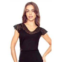 Černá halenka Odina značky ELDAR je esencí ženskosti a elegance uzavřená v nadčasové černé barvě. Model potěší jemnými detaily, které celku dodávají jedinečný, smyslný charakter. Výstřih ve tvaru písmene V a ramena jsou vyrobeny z jemné krajky s květinovým vzorem, která krásně zvýrazňuje horní část siluety a dodává stylingu lehkost. Halenka byla ušita z vysoce kvalitní elastické tkaniny na bázi viskózy, která zajišťuje pohodlí při nošení a dokonalé přilnutí k tělu. Krátké, krajkové kapucínkové rukávy decentně odhalují ramena a zároveň zachovávají elegantní a klasický vzhled. Díky vypasovanému střihu vypadá model Odina dokonale jak pro večerní styling, tak během rande nebo elegantní schůzky. Je nezbytnou součástí šatníku každé ženy, která ocení styl a kvalitu.