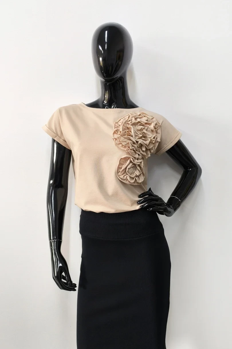 Dodejte svému šatníku nádech elegance a ženského půvabu s touto jedinečnou dámskou halenkou s krátkým rukávem. Její klasický střih s moderním nádechem - ohrnutými rukávy a prodlouženým, mírně zaobleným zadním dílem - je ideální pro každodenní nošení i formálnější outfity. Skutečnou ozdobou jsou 3D květy, které dodávají celku módní a originální charakter. Je vyrobena z měkké, prodyšné bavlny s přídavkem elastanu, což zaručuje pohodlné nošení a lichotivou siluetu.